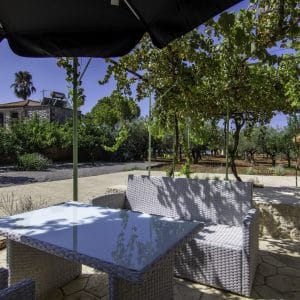 A charming terrace overlooking the olive grove and sea, perfect for dining or relaxation.